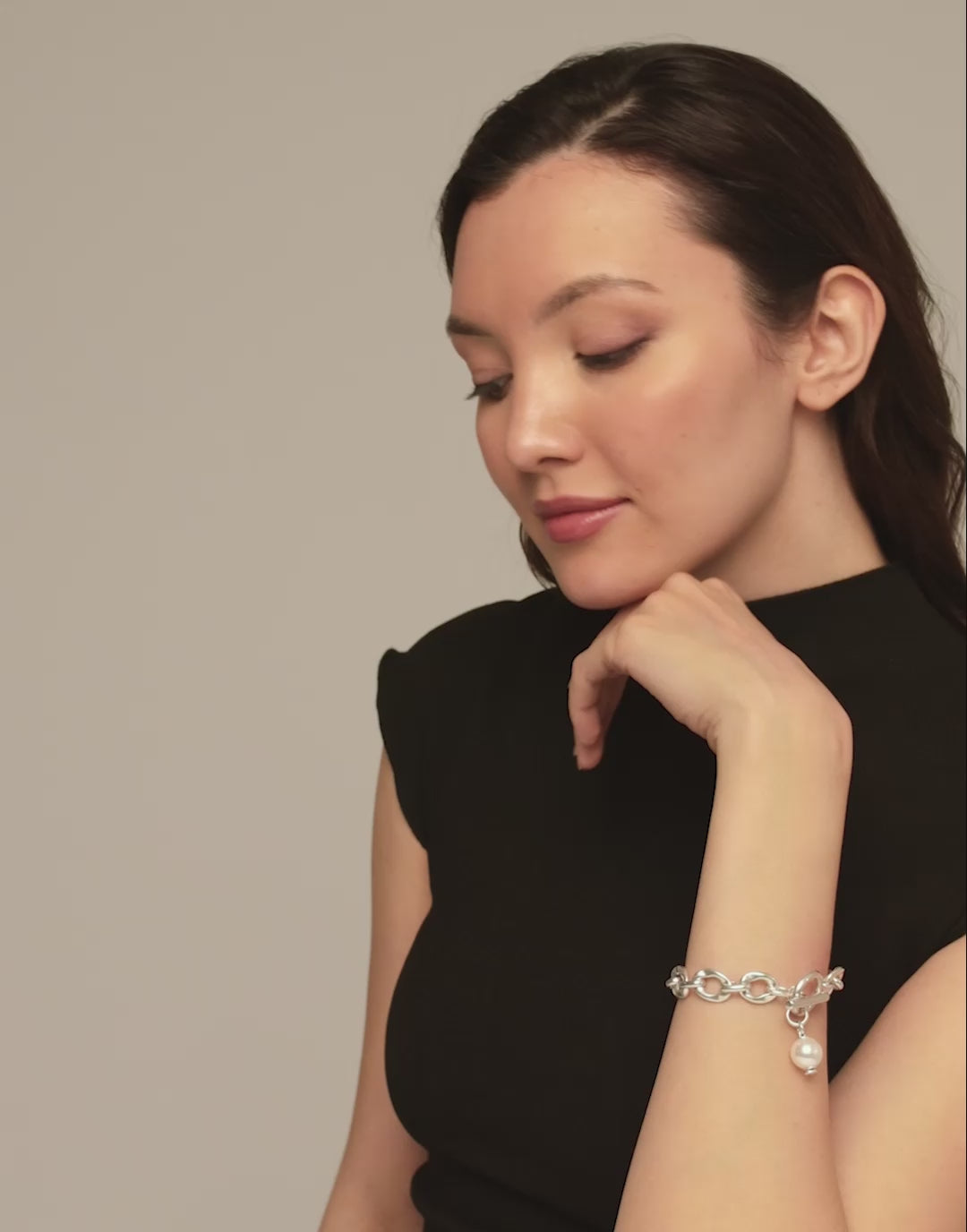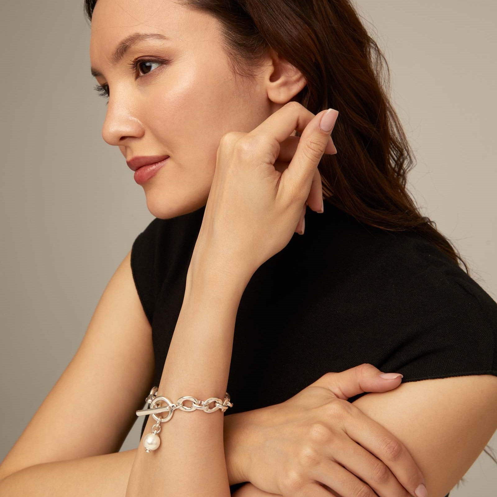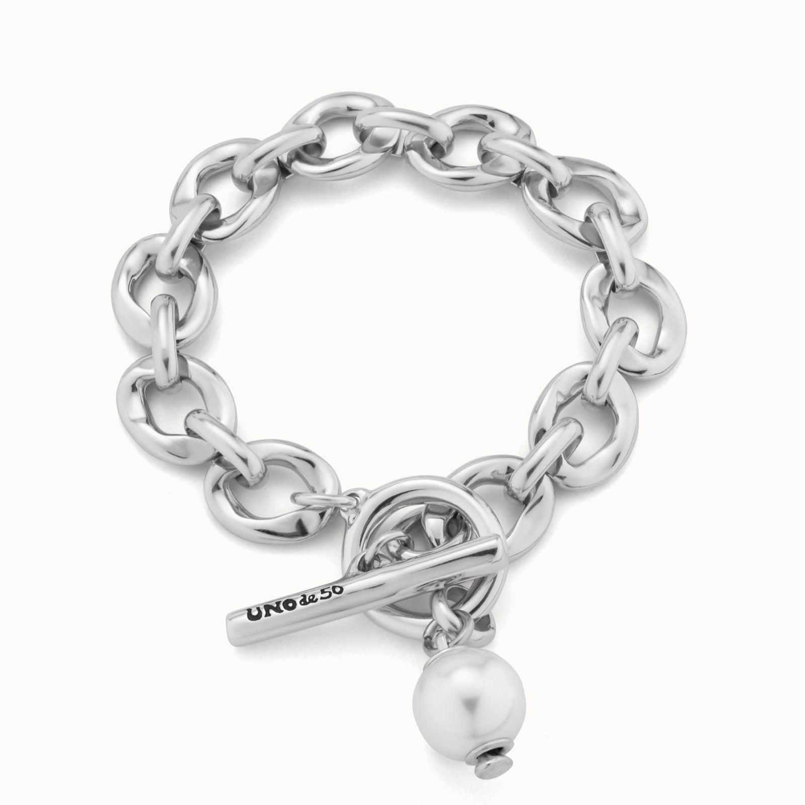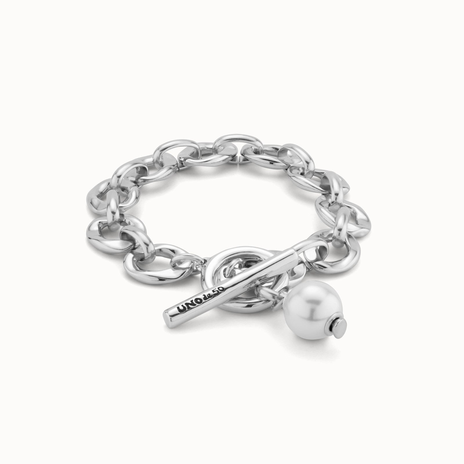 Regular price $250.00The Joyful collection combines different shapes and styles. This allows us to mix and play, to be creative and enjoy every step. Creativity embodied in jewellery such as this bracelet with medium-sized silver plated links, a shimmering shell pearl charm and a ring and bar clasp.