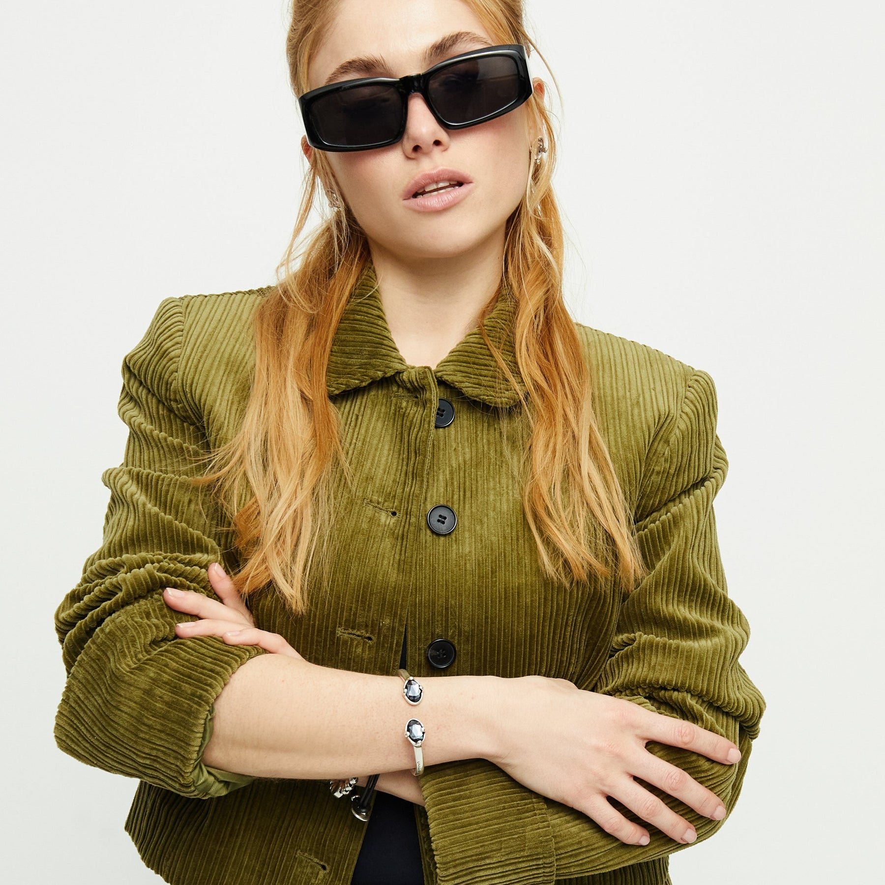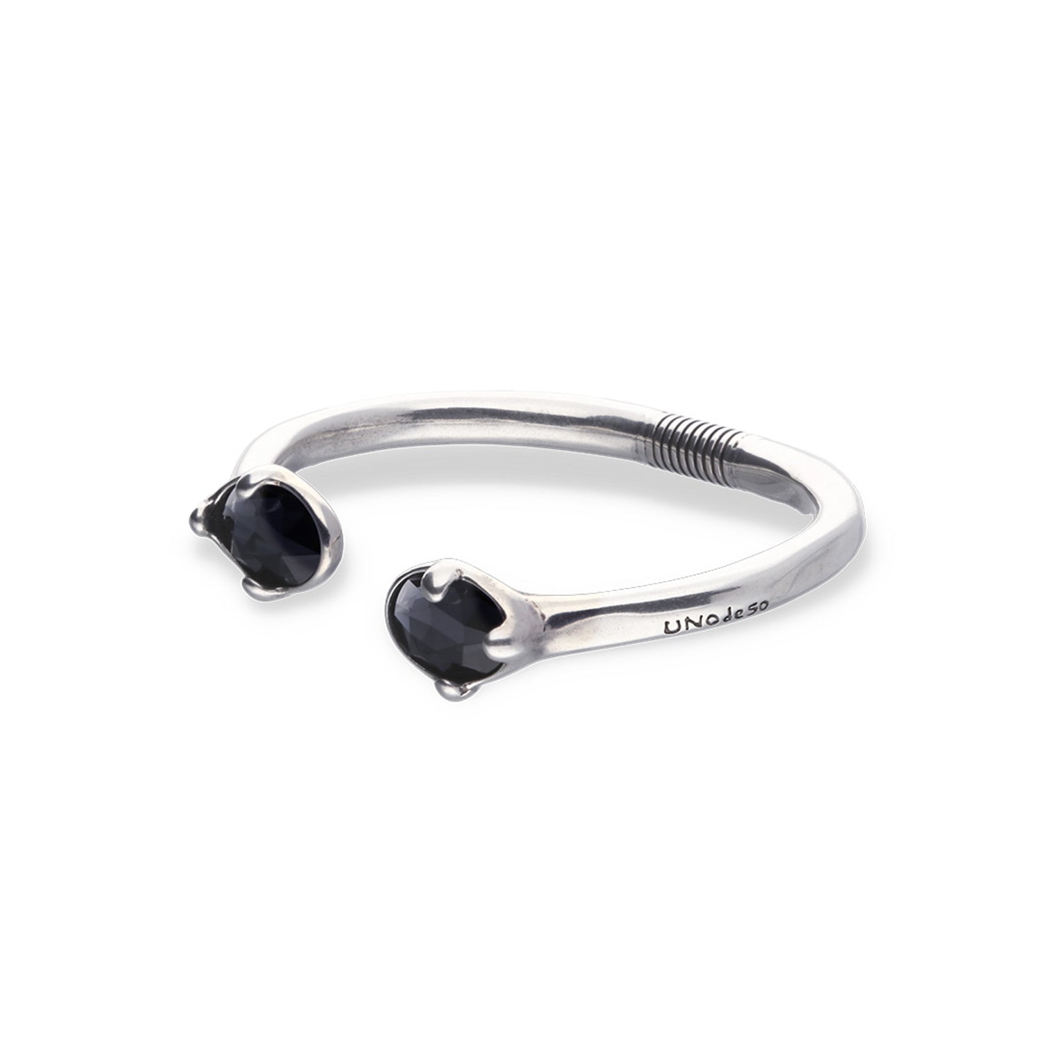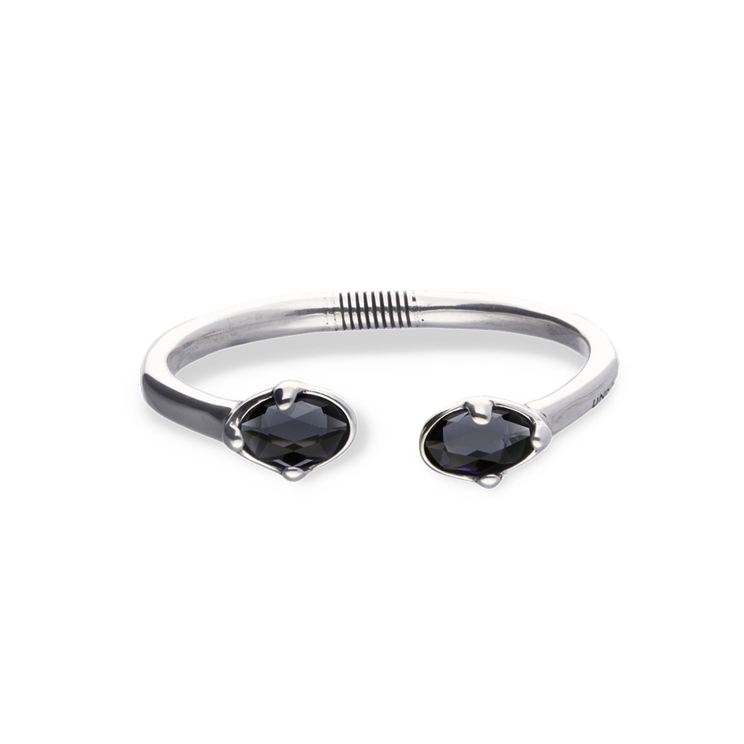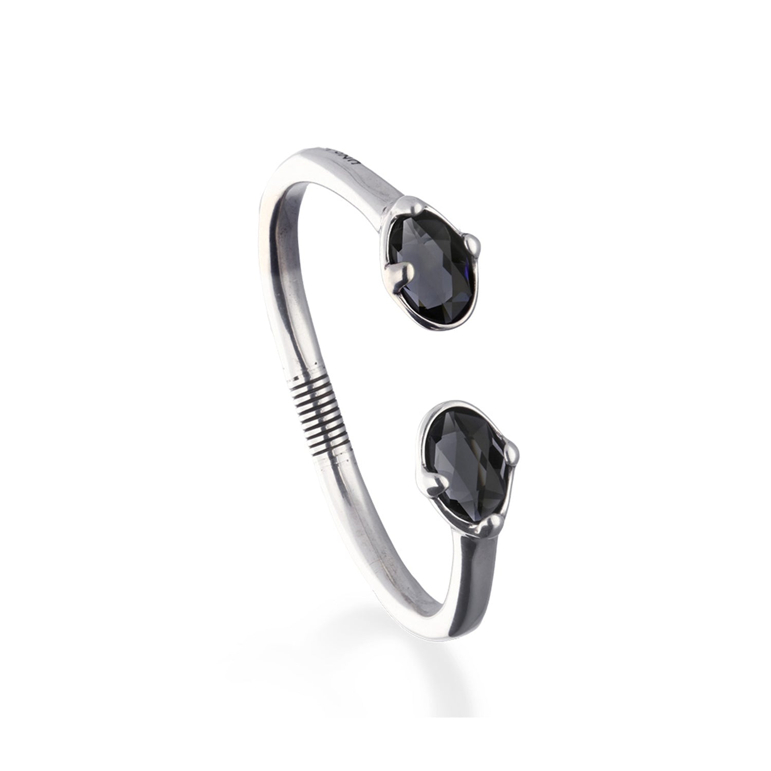 Regular price $319.00Sterling silver plated alloy open rigid bracelet with spring, adorned with grey faceted oval crystals. A dazzling design that is the perfect combination of power and elegance.