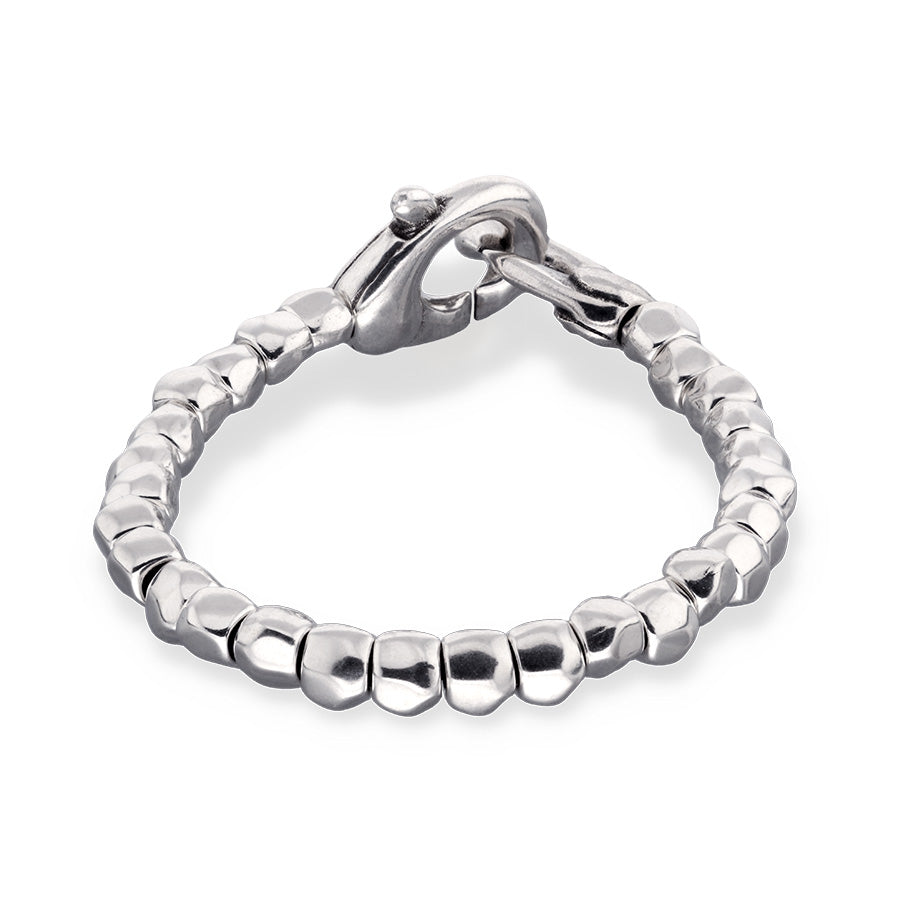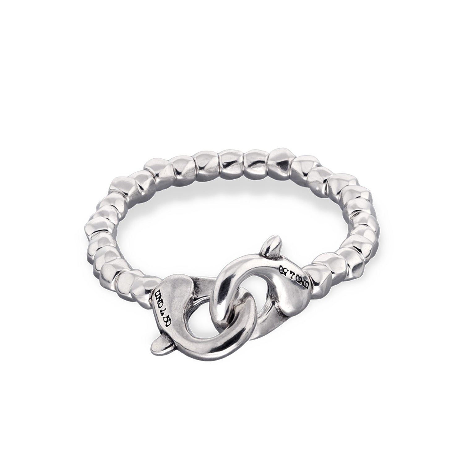 Thick sterling silver plated alloy bead bracelet with large interlocked solid clasp detail. Unisex. The joined clasps symbolise togetherness and a special connection.