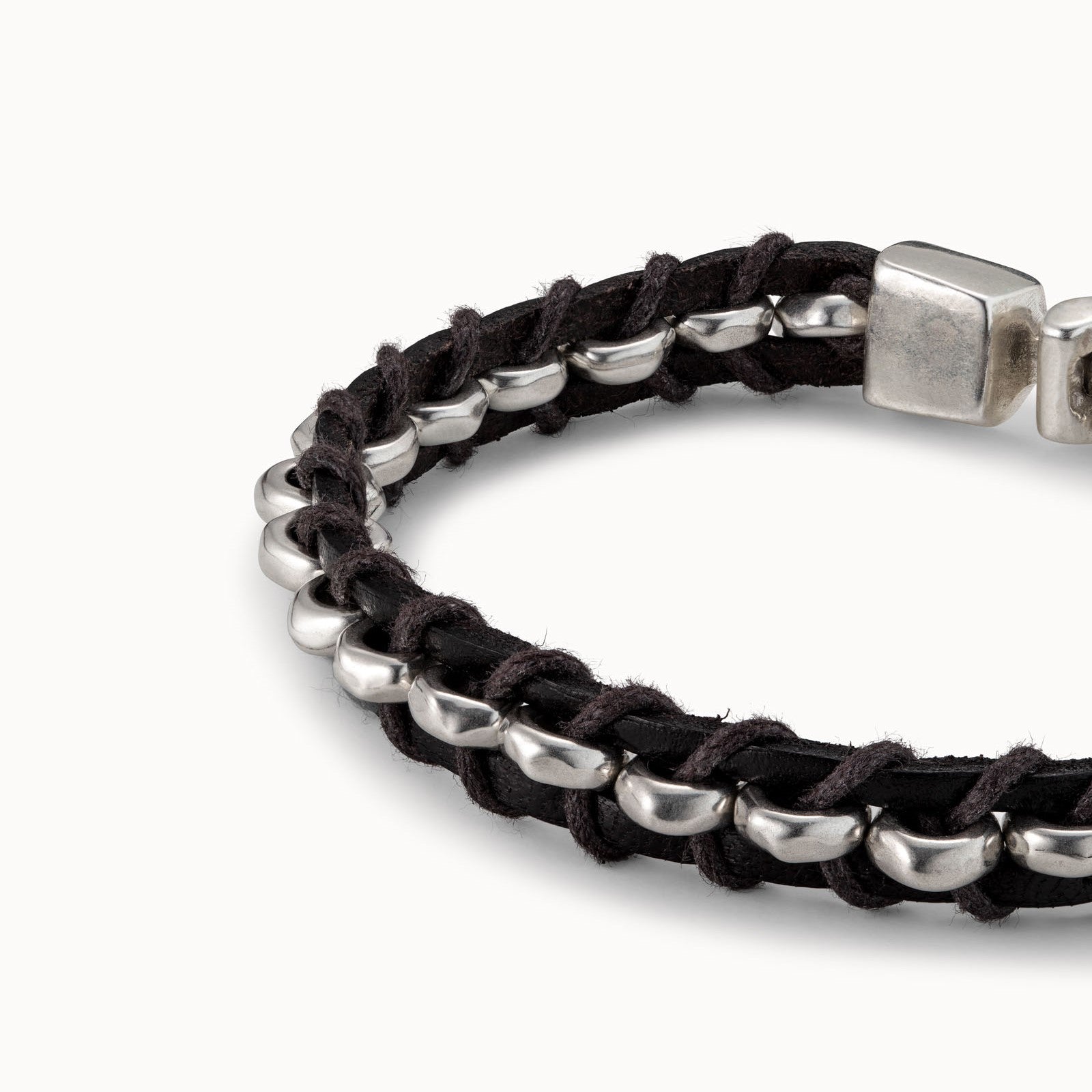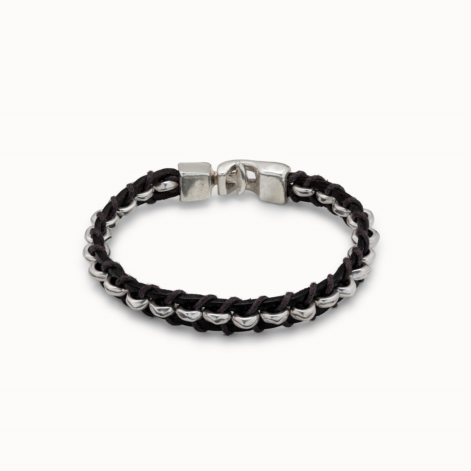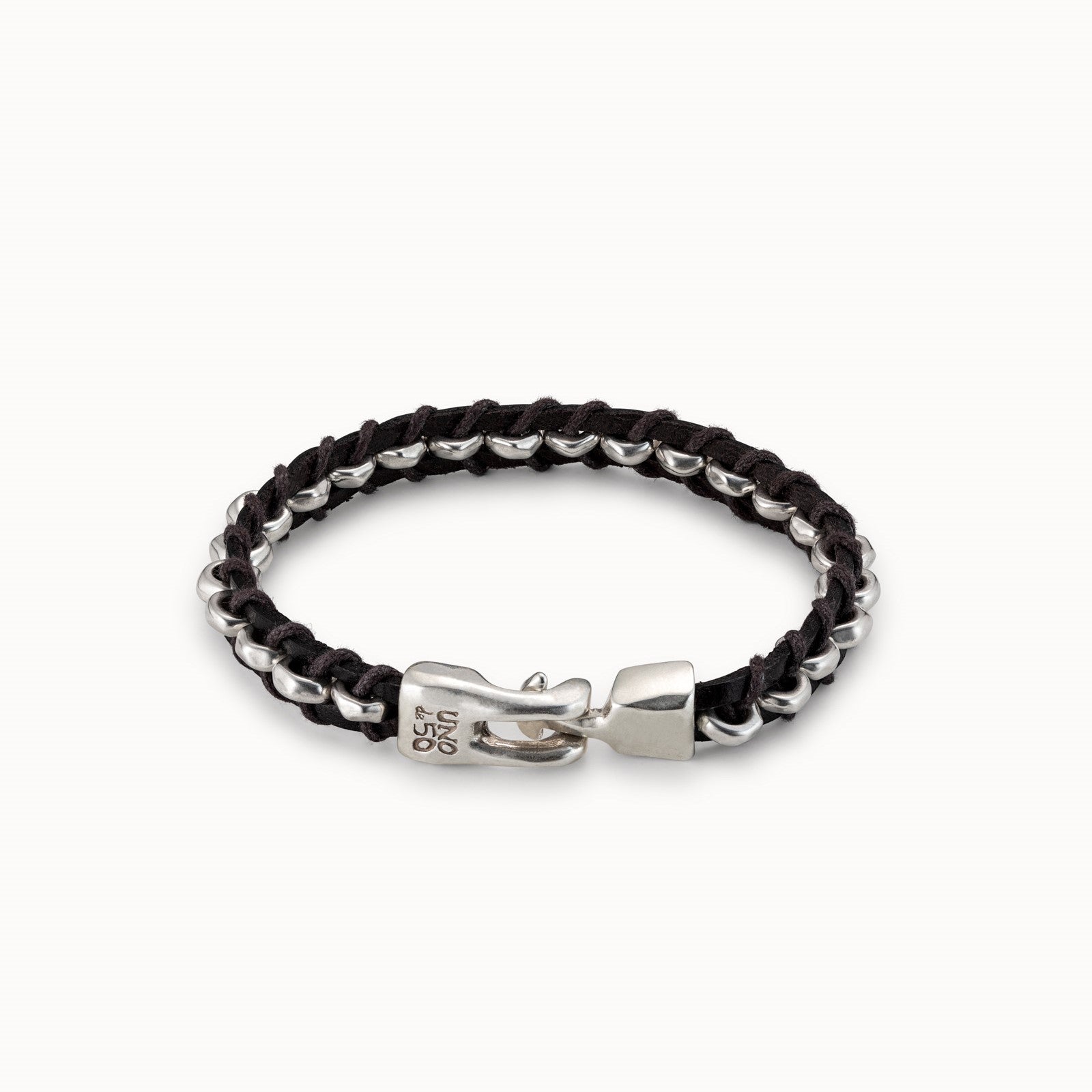 A unisex bracelet made in a unique woven design from dark brown leather and silver-plated feature pieces with a striking handmade hinge clasp, branded with UNOde50 logo.