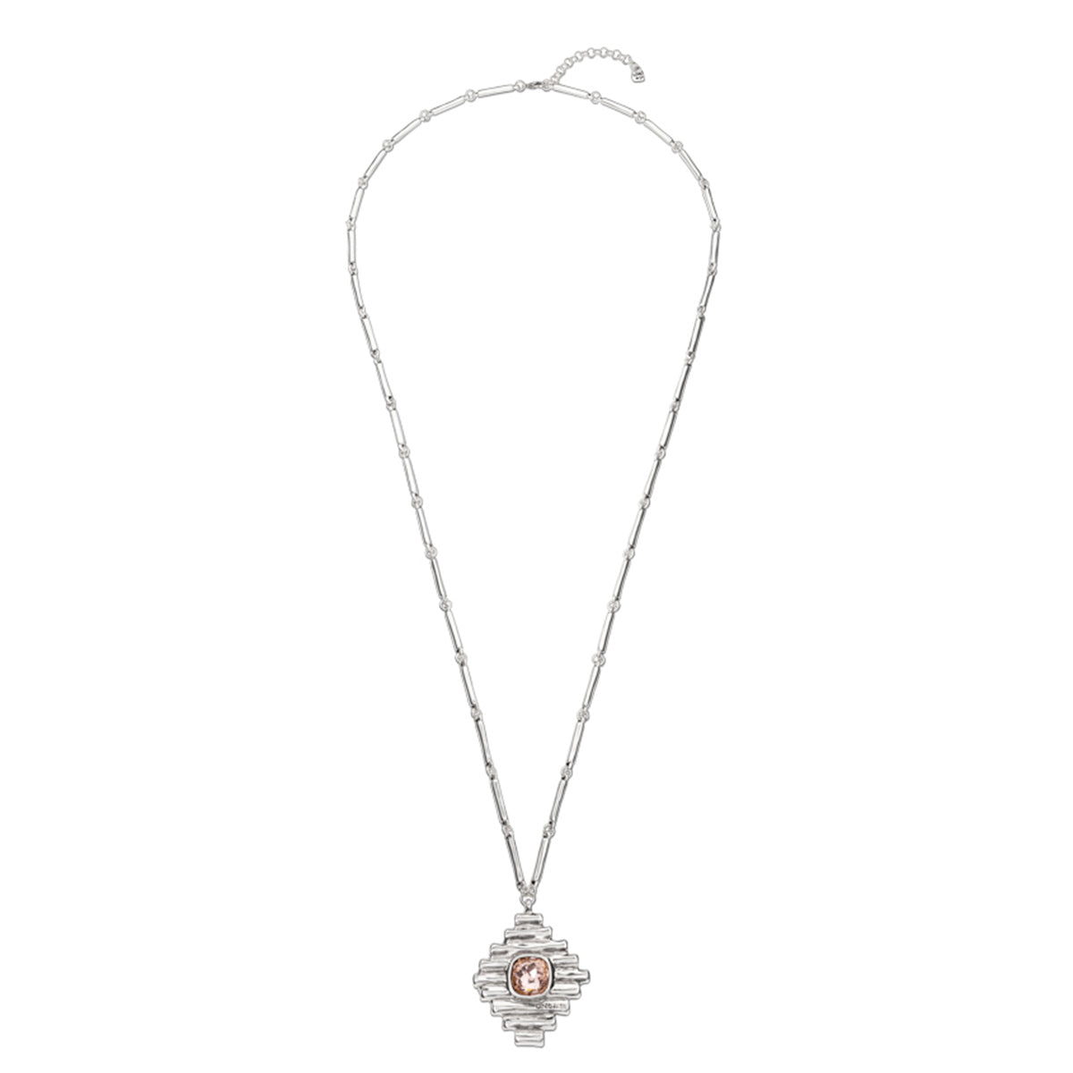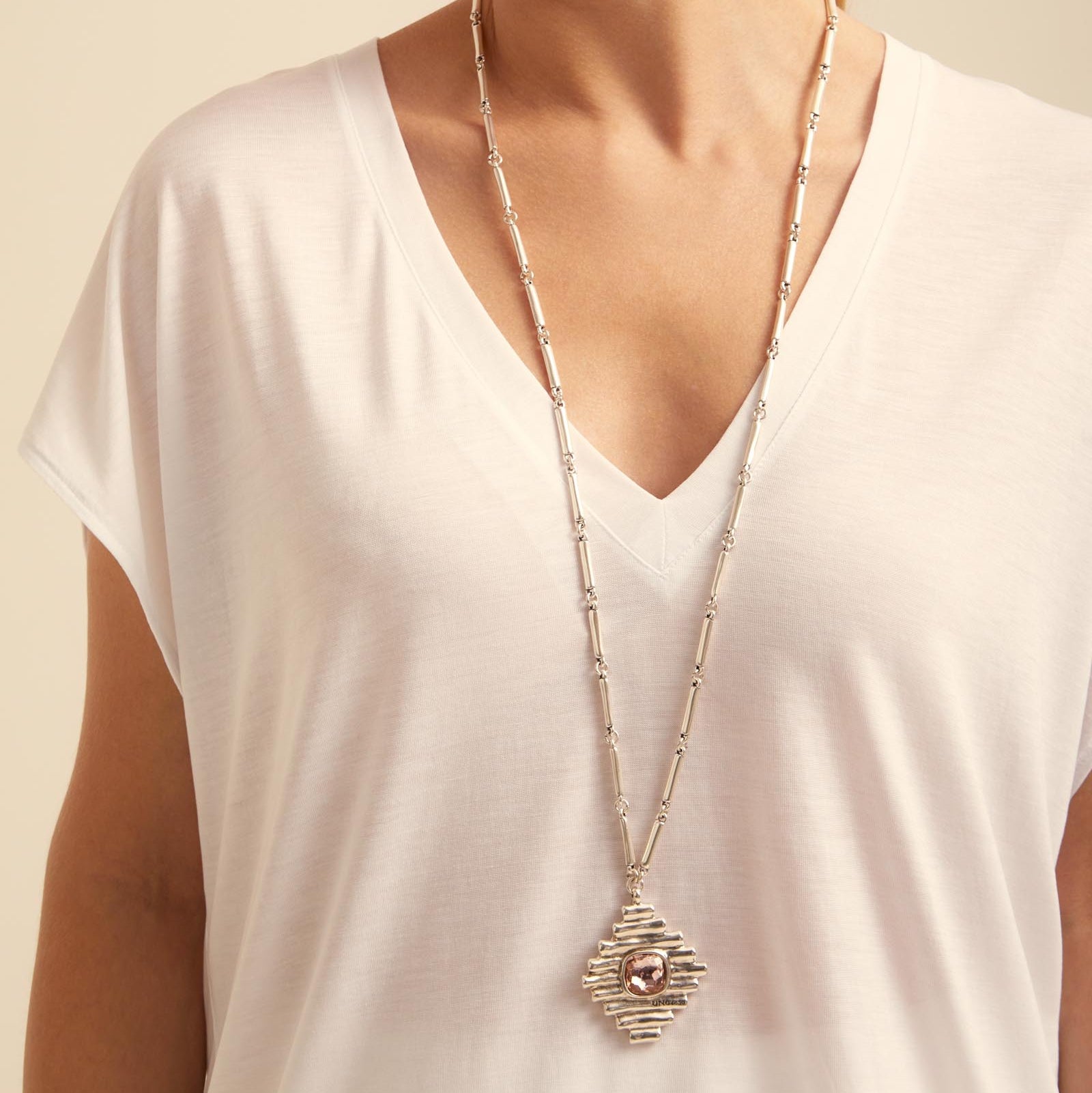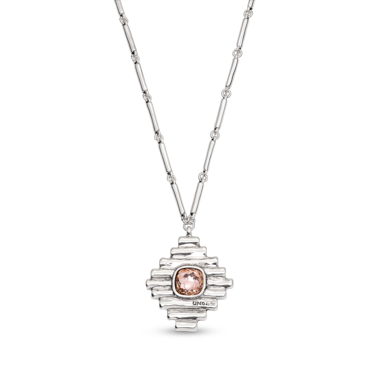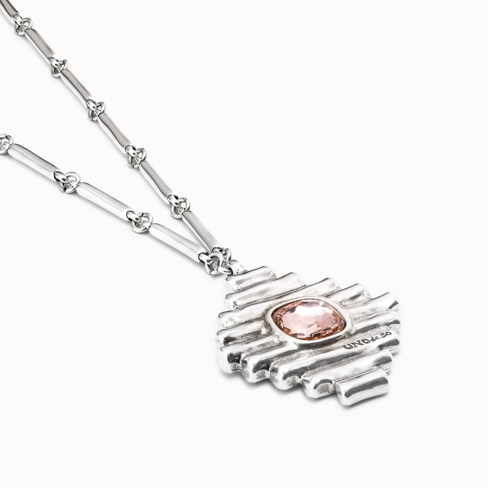 Regular price $395.00The UNO Bossy necklace uses a unique link chain, with a pendant featuring small, short cast tubes and a pink crystal charm. This metallic necklace is entirely handmade in Spain using a silver-plated metal alloy.
