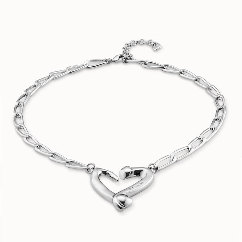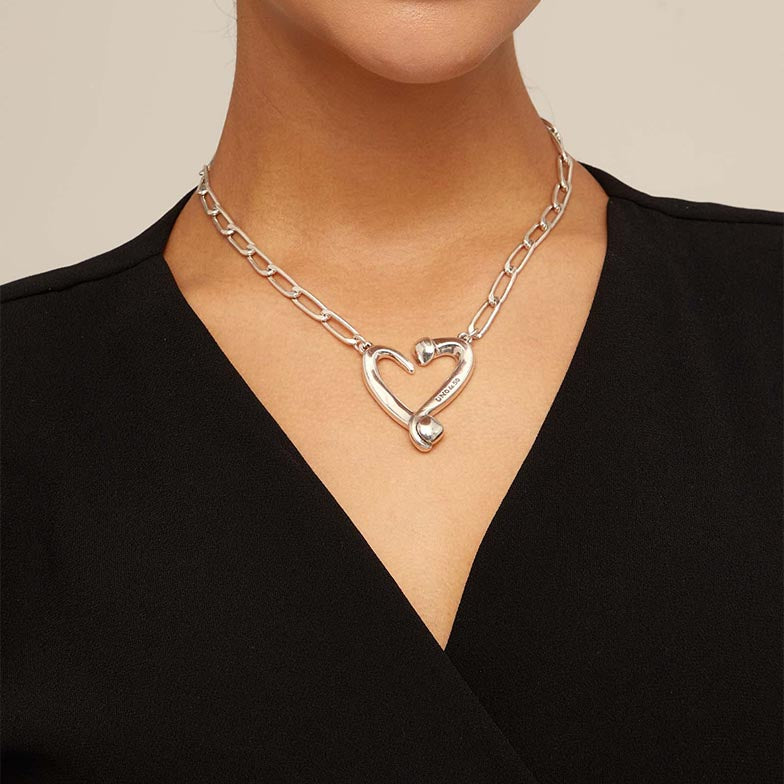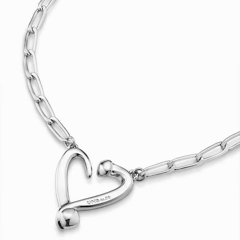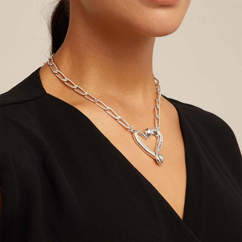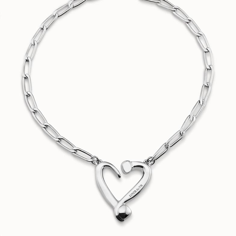 Regular price $270.00The Nails and Hearts necklace is silver plated necklace and has a design of fine nail shaped links linked together with a medium sized heart in the centre.